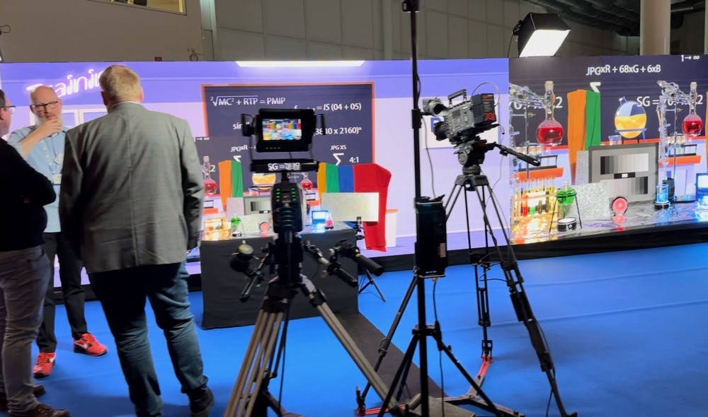 Diesmal war unser Stand mit rund 25 Quadratmetern HDR LED-Wand nicht zu übersehen.So konnten wir einen geschlossenen HDR/WCG-Workflow für eine Studio- oder Bühnensituation zeigen. Mit Know How haben Johannes Grieb und Matthias Wilkens konsistente Helligkeiten und Farben sowie den HDR-Effekt der glänzenden Elemente der Szene sowohl auf der LED-Wand als auch auf dem Display erreicht.